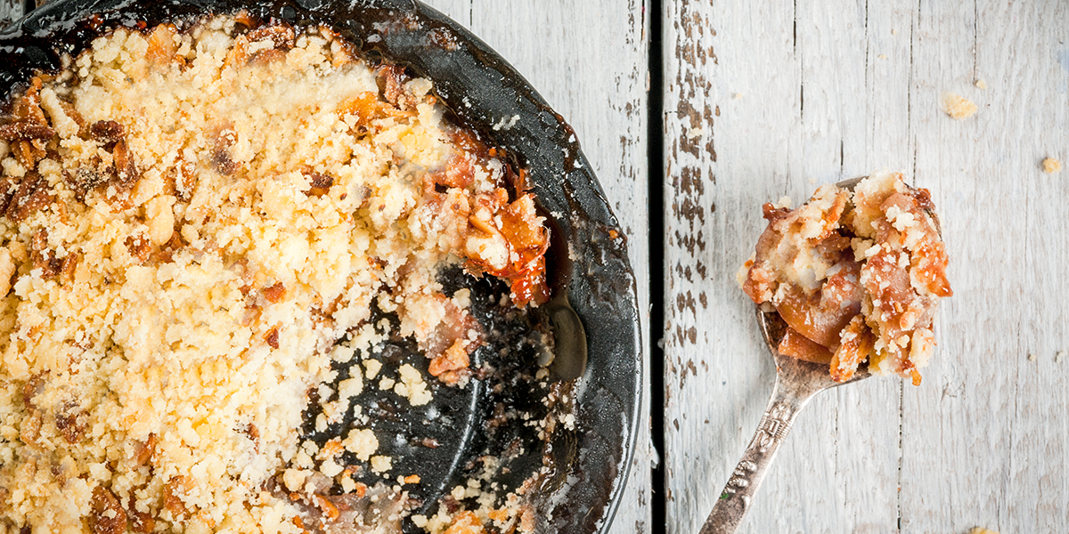 Bake 20 to 30 minutes, depending on the size of the pan, or until the topping is lightly browned and the apples are just bubbling through. Allow to cool slightly, slice and top with either whipped cream or vanilla ice cream.