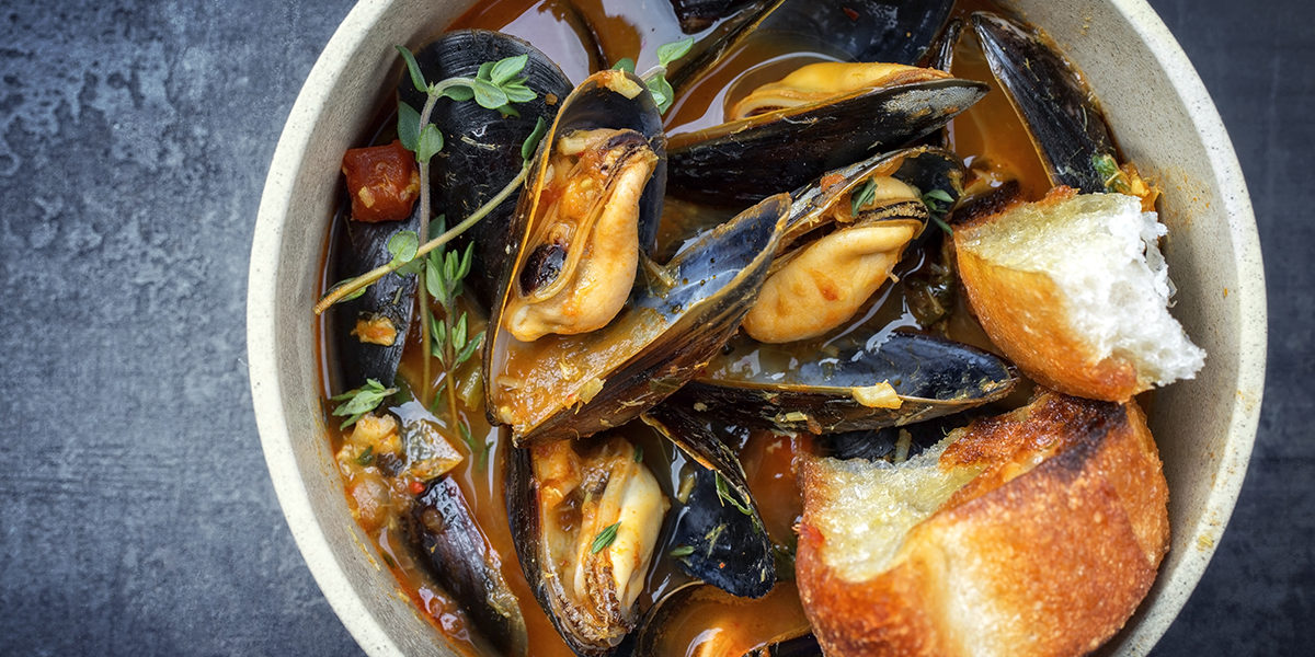 Start by adding the Italian Varietal olive oil to a large sauce pot on medium heat. Add the fennel, onion, garlic and chili flakes. Cook until the fennel and onion become translucent. Add the tomato paste and cook until slightly caramelized. Add the tomatoes, wine and stock. Cook on a low simmer for about 30 minutes. Add the shrimp, clams and mussels. Cook until the clams and mussels open, then add the crab meat and cook until warmed through. Ladle the cioppino into four bowls and drizzle with the aioli and Chili Infused Olive Oil. Top with the baguette slices and fennel tops. Enjoy!